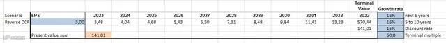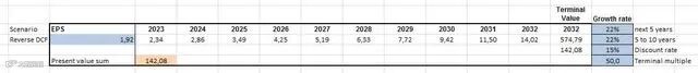 作为反向 DCF 的忠实拥护者,可以了解股票的定价情况。如果采用 TTM 稀释每股收益 1.92 美元,如果想要 15% 的年回报率,会得到以下结果。每股收益年增长率为 22%。从历史数据来看,过去 5 年摊薄后每股收益增长率为 16.56%,稀释后每股收益增长率为 63.83%过去10年。因此,从 5 年的角度来看,这些股票看起来被高估了,但如果它们能实现 10 年的增长率,那么这些股票就被严重低估了。
