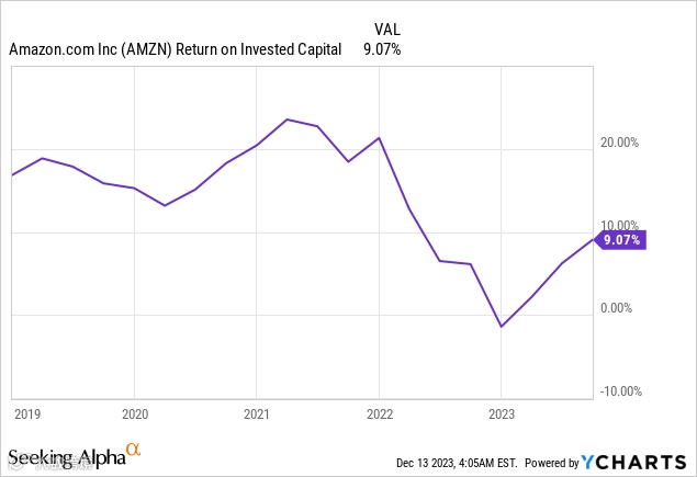 由于对 AWS 基础设施的投资以及美国履行网络的扩张以确保未来增长,ROIC 受到了一些影响。从 20 多岁左右的强劲数字,它短暂地转为负值,但此后又回升。随着亚马逊的投资取得成果,我们很可能会再次看到 20% 以上的资本回报率。