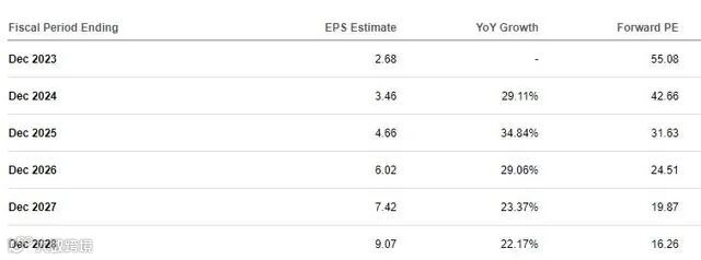 预计 12 月份每股收益为 9.07 美元,增长率为 22%,如果满足以下条件,股价将达到约 450 美元我们采用 50 倍,这可能是历史上合适的。估计 EPS 会低一些,约为 8.00 美元,因此 50 倍将为 400 美元。尽管如此,这两项预测都给投资者带来了 5 年内的强劲上涨空间,即使该股在 5 年内只有 300 美元,投资者也可能轻松击败 SP500。