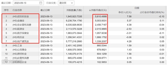 截至9月12日,港股通持股市值最多的行业中,资讯科技业以5610.50亿元排名首位,金融业、非必需性消费、能源业的持股市值都超过2000亿元,医疗保健业、电讯业、地产建筑业的持股市值也均超过1000亿元。