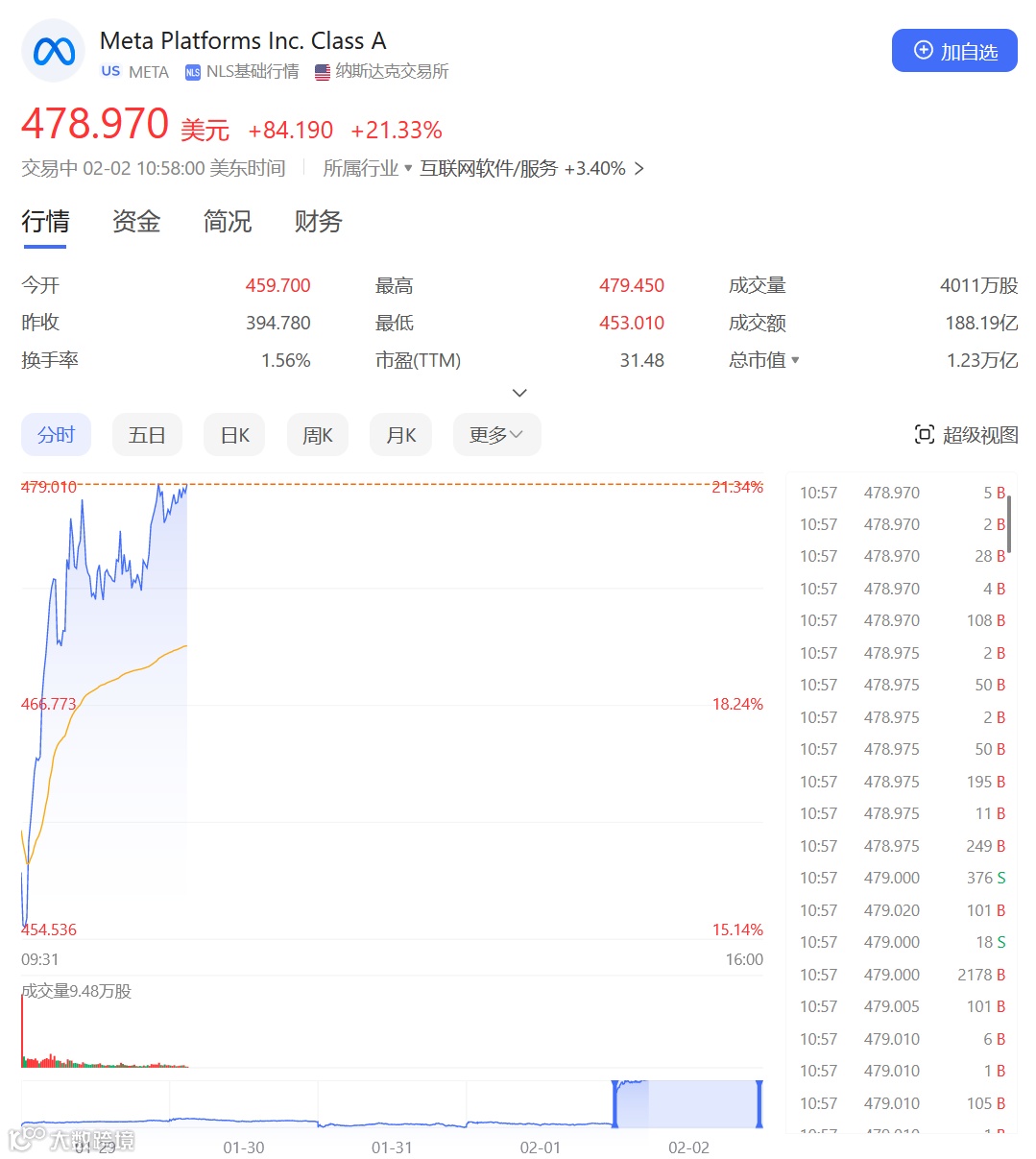 北京时间2月3日0时,Meta股价涨幅扩大至21%,总市值达1.23万亿美元(约合人民币8.84万亿)。盘中市值增加大约2000亿美元(约1.4万亿元人民币),超越苹果和亚马逊此前所创最佳单日表现,苹果市值曾在2022年11月10日增加1909亿美元、亚马逊当年2月4日曾增加1908亿美元,英伟达曾在2023年5月25日增加1841亿美元。