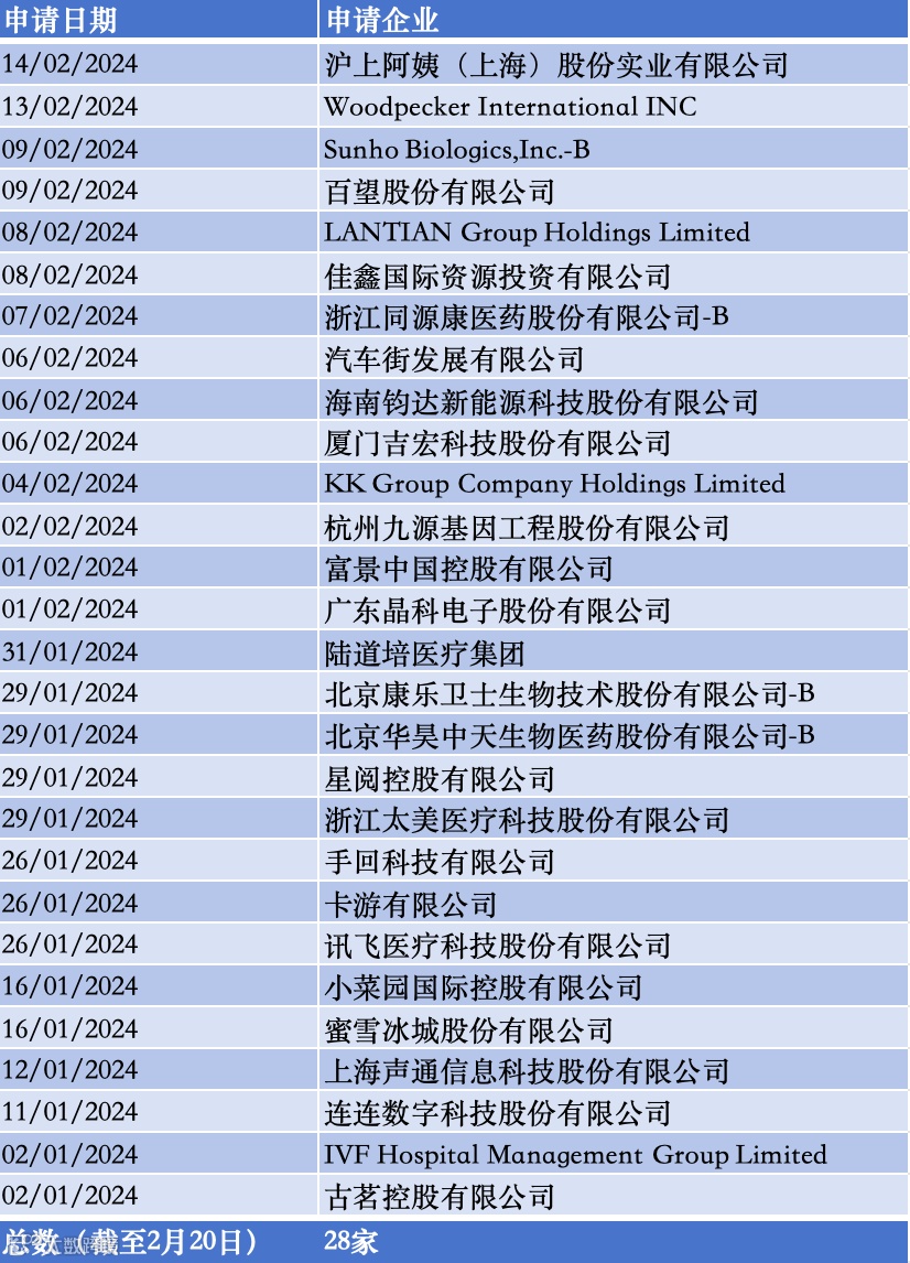 据港交所网站信息,截至2月20日,2024年以来共有28家企业递表港交所,其中1月有14家,2月截至目前也是14家。