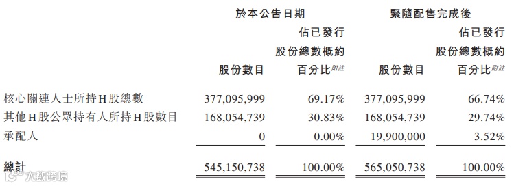 配售及认购完成后,核心关联人士所持H股总数将摊薄至66.74%。