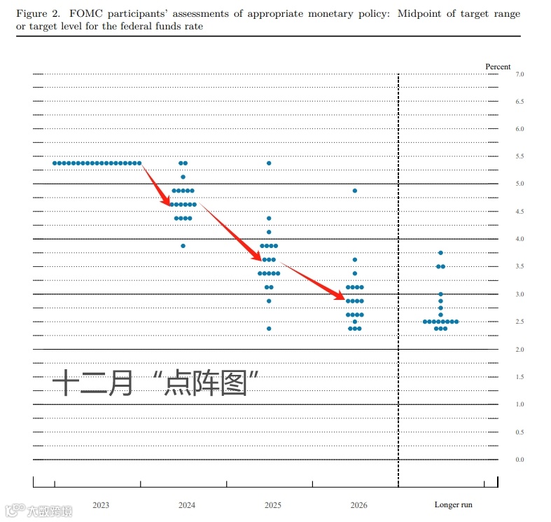 相较于此次决议,股民更加关注美联储的12月经济预期,特别是其中隐含2024年所有货币政策制定者降息预期的“点阵图”。数据显示,FOMC委员们对2024年的政策利率中位预期为4.6%,隐含着明年降息75个基点的含义,稍稍超出预期。另外,他们对2025和2026年的政策利率中位预期分别为3.6%和2.9%。