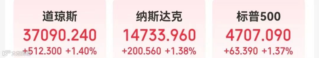 美股三大指数集体收涨,道指突破37000点,涨幅1.4%,创收盘历史新高;纳指涨1.38%,标普500指数涨1.37%,纳指、标普500指数创去年年初以来新高。