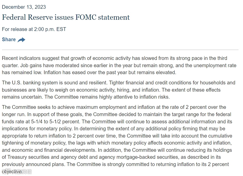 当地时间12月13日,根据美联储最新的联邦公开市场委员会(FOMC)货币政策会议纪要显示,美联储决定12月仍放缓加息步伐,将联邦基金利率目标区间继续维持在5.25%至5.50%之间。值得一提的是,美联储主席鲍威尔罕见作出明确表态:降息已开始进入视野。