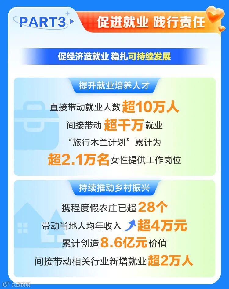 截至2023年,通过自身招募以及平台注册的导游、定制师等方式,携程直接带动就业人数超10万人,加上在平台提供酒店、机票、门票、用车等服务的从业者,间接带动就业人数超1000万。世界旅游及旅行理事会预测,2023年中国旅游及旅行业直接或间接就业岗位数量,或将占就业岗位总数的10%。促进旅游行业就业,将有效助力全社会就业问题的解决。
