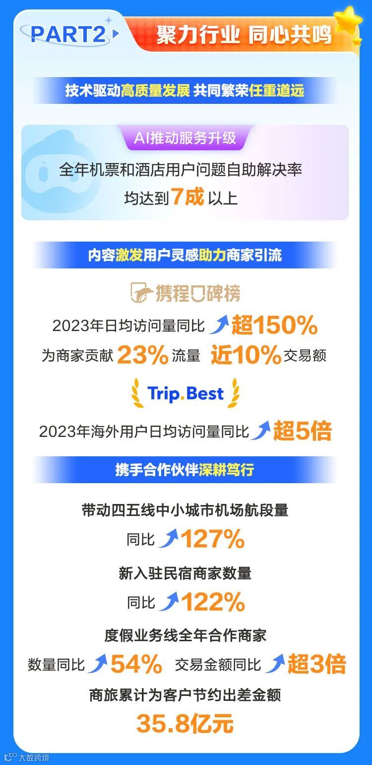 携程始终坚持为合作伙伴创造共赢价值。2023年,通过精细化运营,携程平台上,四五线中小城市机场航段量大幅增长,同比2022年增长127%,比2019年增长13%。携程全年新入驻民宿商家数量同比增长122%,通过专业培训、流量曝光等措施,23年民宿新商家GMV比22年民宿新商家GMV增长超3倍。携程旅游度假业务全年合作商家数量同比增长54%,交易金额同比增长超3倍。截至2023年年底,携程商旅累计为96万家成长型企业、1.5万家大型企业提供数字化赋能,助力企业差旅管理费用最高减少30%,2023年帮助企业客户节约差旅成本35.8亿元。