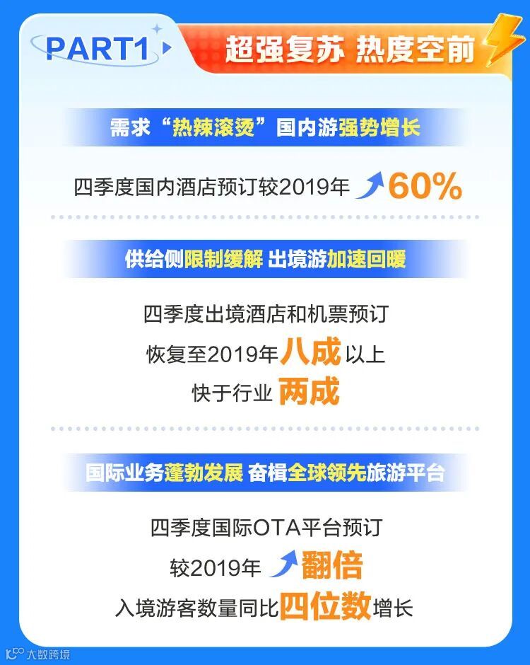 国际化布局和服务能力,使得携程更早受益于入出境游的复苏,实现国际业务的快速增长。第四季度,携程出境酒店和机票预订恢复至2019年同期的80%以上,相较之下,国际航空业客运量恢复至60%。携程集团旗下国际OTA平台总预订同比增长超70%。