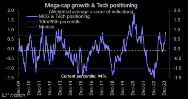 大型成长型科技公司的仓位处于第94百分位,但仍略低于2021年全盛时期的高点。