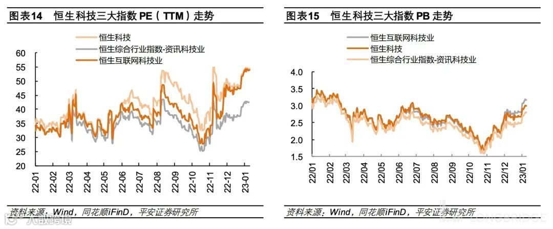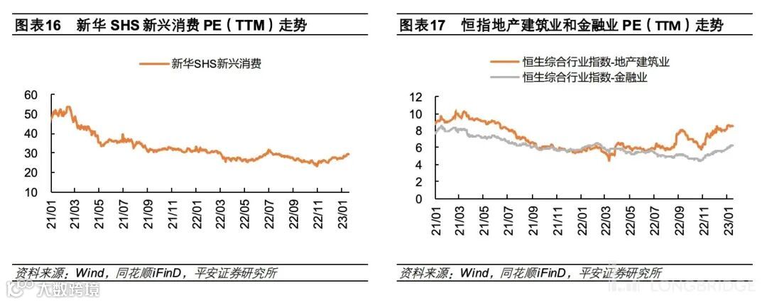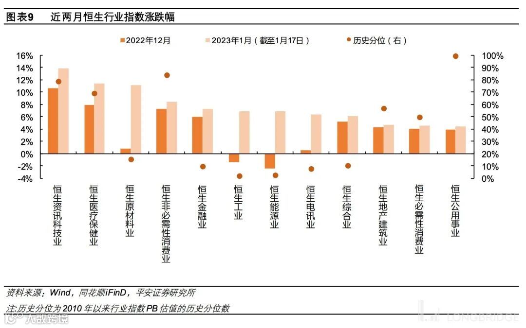 估值偏低高弹性的 “一体两翼” 中,恒生科技互联网在近期港股估值修复中起到关键作用,当前无论是指数还是估值都维持上涨趋势,但仍然有较高修复空间;伴随着近期消费渠道回升,新兴消费弹性也将加大;防疫政策优化下,出行需求修复将提振交通运输和旅游业的复苏。同时,在内需修复下,制造业龙头将迎来经营稳健状态下的盈利回升;港股金融地产也迎来估值修复,上游周期景气有望延续。