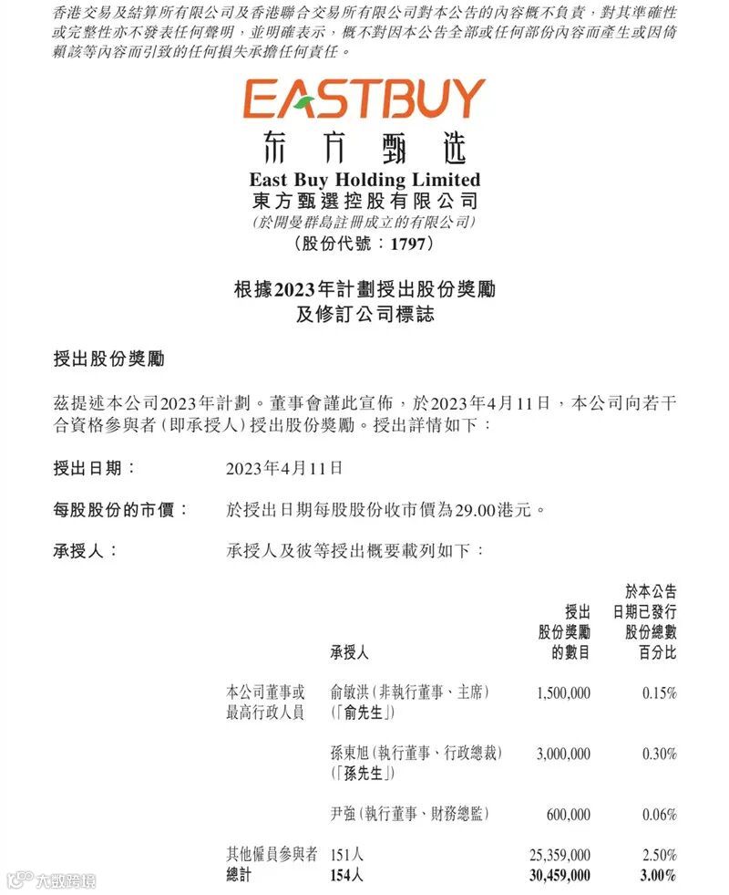 4月11日晚间,东方甄选发布公告称,向154名合格参与者(承授人)授出股份奖励3045.9万股。