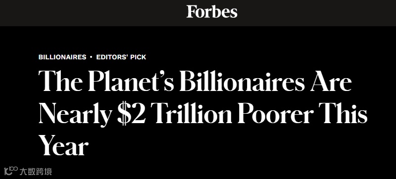 根据福布斯(Forbes)报导,受科技股暴跌拖累,今年全球亿万富翁共损失近2兆美元,其中有约三分之一由美国富豪承受,特斯拉(Tesla)CEO马斯克惨沦最大输家。