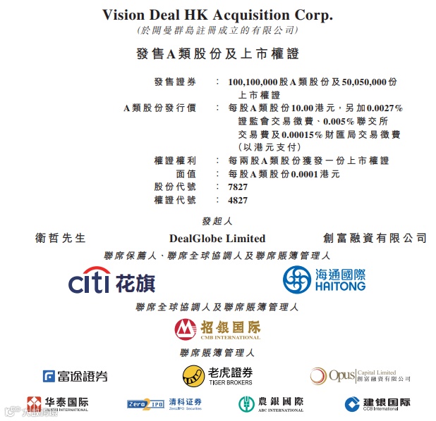 香港SPAC公司VISION DEAL HK ACQUISITION CORP. (以下简称"VISION DEAL") (07827.HK,04827.HK)公布正式上市文件,A类股份及上市权证预计将于6月10日在港交所挂牌上市。