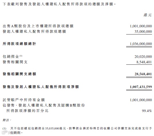 包销佣金为发售A类股份募资额的2%,发售相关开支包括联交所上市费、证监会交易征费、联交所交易费、财汇局交易征费、法律及其他专业费用以及印刷及与发售有关的所有其他开支。