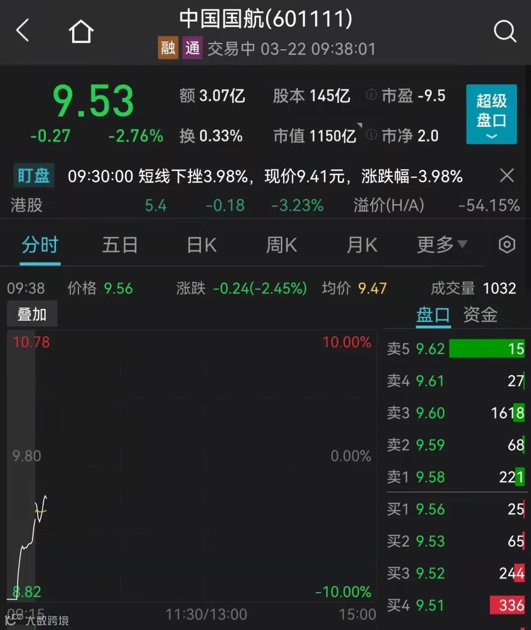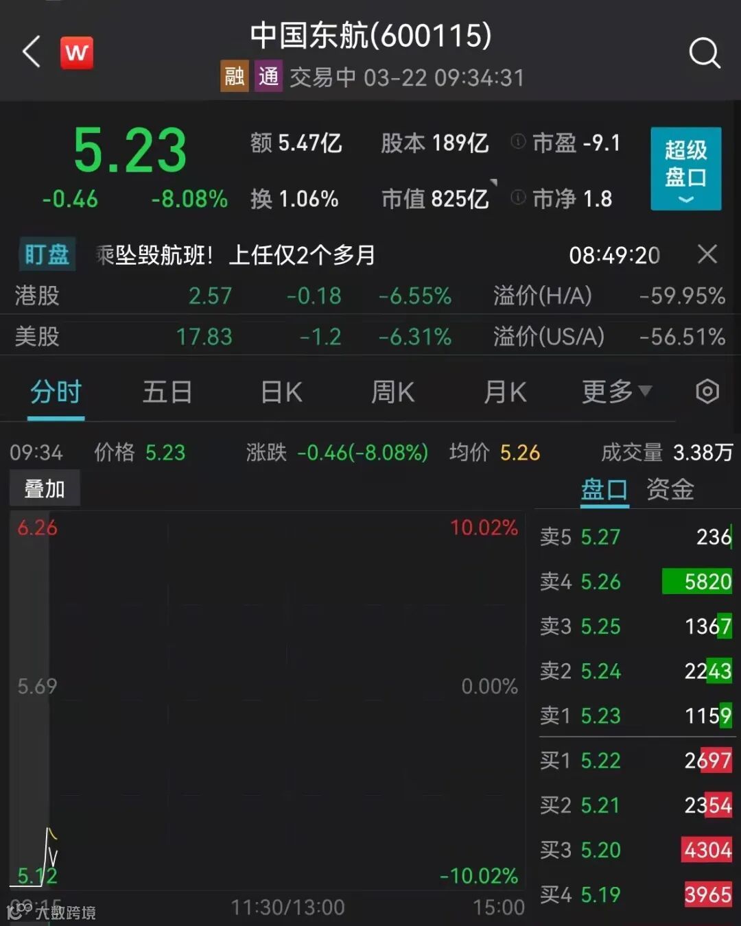 22日早盘,民航板块开盘领跌,中国东航跌超8%