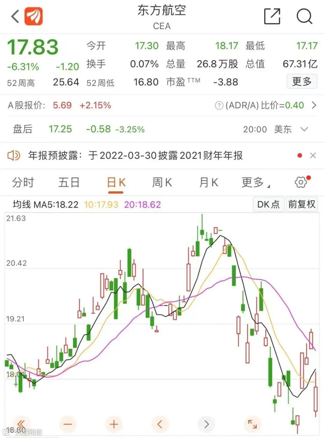 隔夜美股方面,东方航空收跌6.31%,报17.83美元/股。