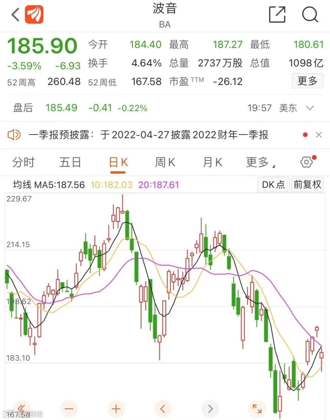 截至21日美股收盘,波音股价下跌3.59%,报185.9美元/股,总市值1098亿美元。