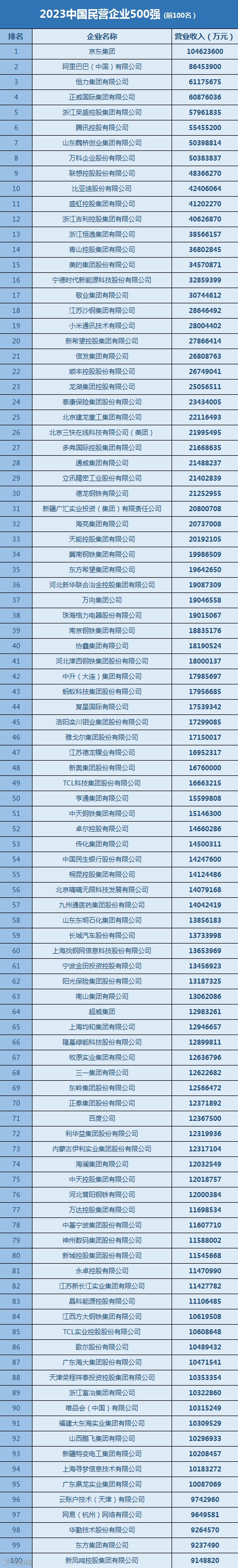 全国工商联9月12日发布2023中国民营企业500强榜单和《2023中国民营企业500强调研分析报告》。京东集团、阿里巴巴(中国)有限公司、恒力集团有限公司位居榜单前三位。