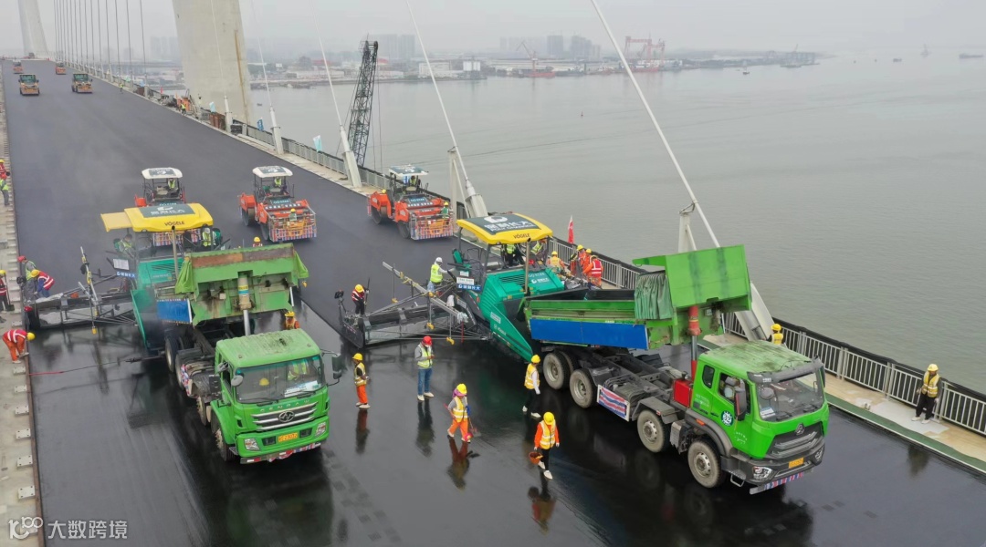 随着中山大桥钢桥面铺装完成,累计施工面积已突破15万平方米,约占钢桥面摊铺总量的40%。