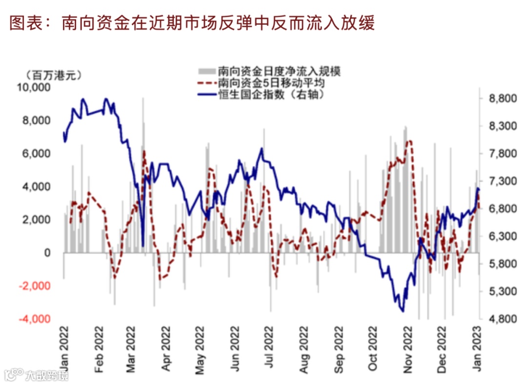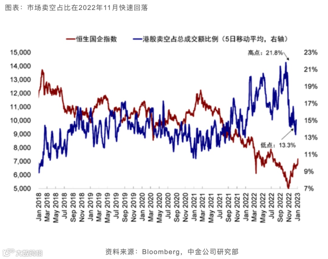 中金公司经过分析对比数据得出结论:南向资金自去年11月市场反弹以来流入反而放缓,海外主动资金流出虽然放缓但并未逆转成流入,说明两者可能都不是近期反弹的主力。排除掉上述可能后,叠加近期港股卖空成交占比明显回落,可能表明空头回补与一些交易型资金或是主要动力。