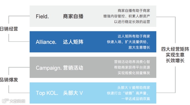 简单来说,商家自播 (Field) 和达人矩阵 (Alliance) 用于构建稳定的日常销量,而营销活动 (Campaign) 和头部大V (Top KOL) 用于实现规模化的品销爆发。商家可以基于不同阶段的GMV增长需求,灵活分配四大经营阵地的运营资源与营销投入,实现抖音电商生意总量稳定、高效的持续增长。