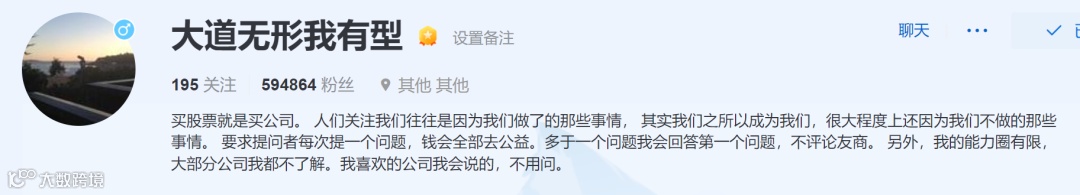 资料显示,段永平的雪球账号有近60万粉丝。简介中他表示:"买股票就是买公司。我喜欢的公司我会说的,不用问。"