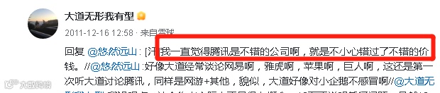 段永平回复称,“我一直觉得腾讯是不错的公司啊,就是不小心错过了不错的价钱。”