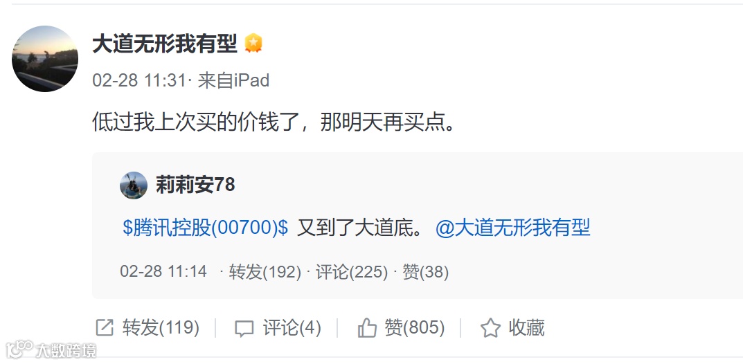而在2月28日时他已经发声:“腾讯低过我上次买的价钱了,那明天再买点。”