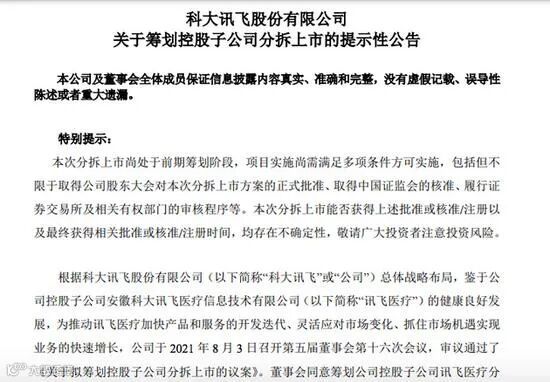 市场消息,科大讯飞(002230.SZ)拟分拆旗下从事医疗人工智能业务的子公司安徽科大讯飞医疗信息技术公司(简称“讯飞医疗”) 赴港上市,计划集资约5亿美元(约39亿港元)。科大讯飞此前发布公告称,董事会同意筹划公司控股子公司讯飞医疗分拆上市事项。本次分拆上市完成后,公司仍将维持对讯飞医疗的控股权,其持股约51%。