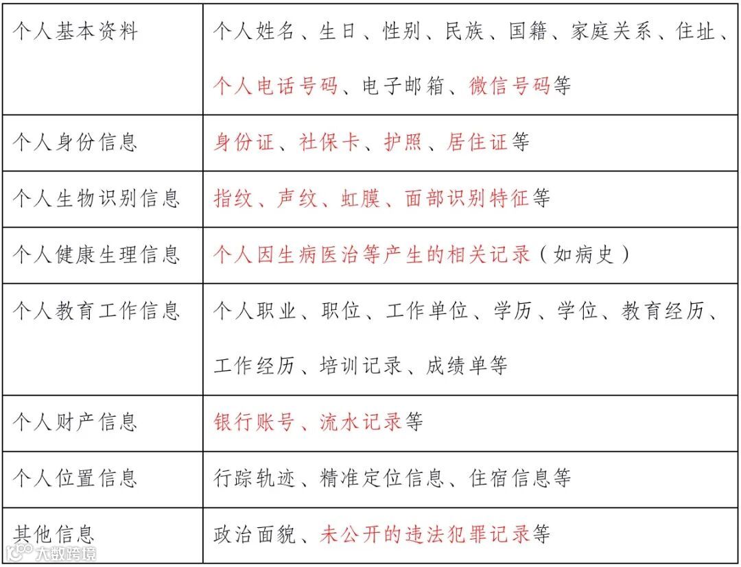 注:红色字体标注的信息一般为个人敏感信息,是指一旦泄露、非法提供或滥用可能危害人身和财产安全,极易导致个人名誉、身心健康受到损害或歧视性待遇等的个人信息[2]。