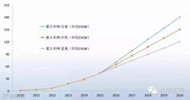 根据上图,国家重点支持光伏产业发展,未来发展空间很大,有无限大的市场空间,“十三五”期间预测应该会超过150GW。