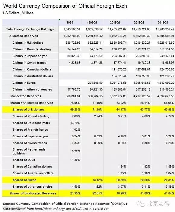 而2015年的第三季度外汇储备数据(COFER)显示,当今美元作为外汇储备,仅占国际已作分配的外汇储备的63.98%,而欧元则占到20.34%。虽然增速缓慢,但是欧元确实在一点点的蚕食美元的霸主地位。