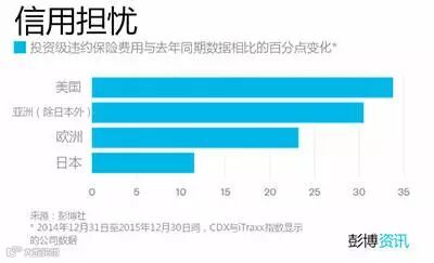 与此同时,提供一系列违约保险的信用衍生品市场显示,人们对美国企业的资金状况日渐担忧。2015年12月30日,为1千万美元债务所投的5年期保险费用超过了8.9万美元,此笔债务由一群信用等级为投资级的美国企业背负,而2014年,保险费用仅为2.2万美元。这一增长幅度远大于欧洲、日本及亚洲其他国家。下图是相关数据: