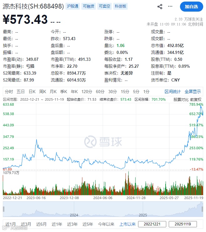 源杰科技(688498.SH)于2022年12月21日在上交所上市,截至2025年11月19日收市,其总市值约492.85亿元人民币。