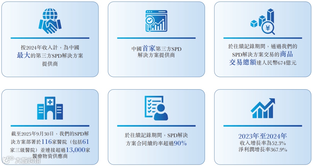 截至2025年9月30日,公司的SPD解决方案部署于中国13个省份的116家医院,包括根据弗若斯特沙利文报告已采用SPD解决方案的8家A++医院中的3家,以及91家三级医院(其中61家为三级医院)。