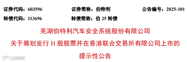 来自安徽芜湖的A股上市公司伯特利(603596.SH)发布公告称,为深化国际化战略布局,完善海外产能布局,提升公司品牌国际影响力,积极借助国际资本市场拓展多元化融资渠道,助力公司高质量发展,正在筹划发行境外股份(H股)并在港交所上市事宜。