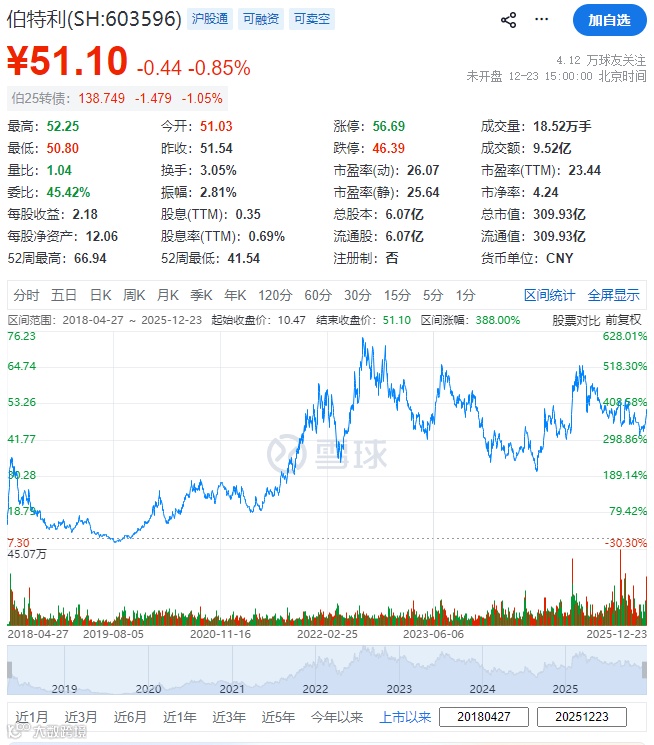 伯特利(603596.SH)于2018年4月27日在上交所上市,截至周二(12月23日)收市,其总市值约309.93亿元人民币。