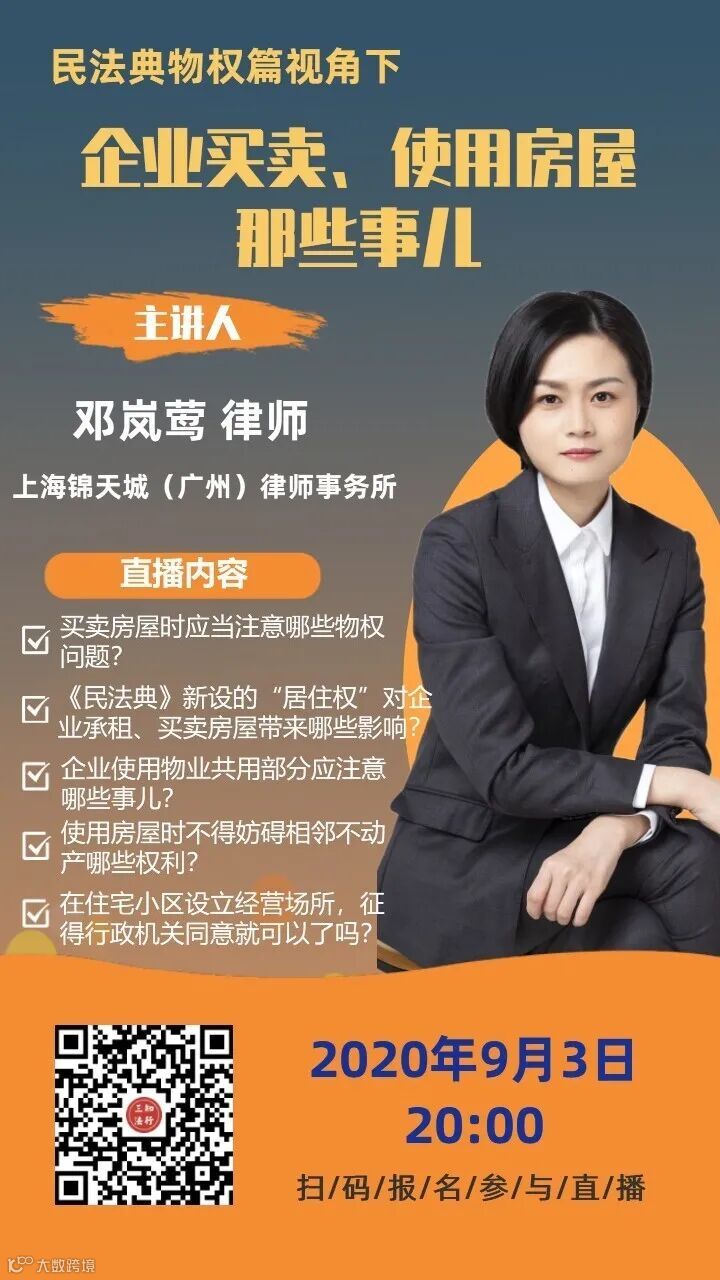 本期“民法典走进企业”系列线上讲座第七讲,将为您介绍《民法典》物权编中,与企业承租、使用、买卖房屋相关的新规定。此次,《民法典》物权编新设居住权会对购买、承租房屋产生什么影响?哪些行为可能侵犯相邻关系?设置户外广告需要其他业主同意吗?“住改商”有哪些注意事项?本期讲座,邓岚莺律师将详细介绍这些您可能关心的物权问题。