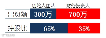 其中:创始人团队占股65%,缴纳注册资本650万元;财务投资人占股35%,缴纳注册资本350万元。作为人力资本因素对价,财务投资人向创始人团队附条件赠与350万元。创始人团队受赠与后,将受赠款项连同自有资金300万元,合计650万元,用于缴纳注册资本。