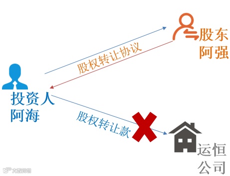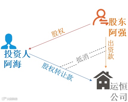依旧以阿海的投资为例,阿强持有运恒70%的股权,皆为认缴出资。阿强与阿海签署的《股权转让协议》可以约定,阿强将其持有的25%股权作价500万元,转让给阿海;25%股权的实缴义务由阿强完成,阿强需向公司支付500万元,阿海应向阿强支付股权转让款500万元;阿海将应支付的股权转让款直接作为阿强的出资款,支付给公司。这样阿强对公司的出资之债、阿海对阿强的股权转让之债抵销,阿海向公司投资500万元后,阿强无权再要求其支付股权转让款。