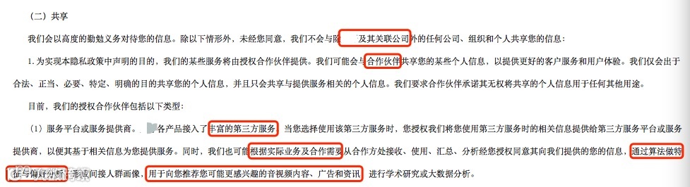 其中共享目的“推荐您可能更感兴趣的音视频内容、广告和资讯”,难言符合必要性,也可能被认为属于一项“一揽子授权”,剥夺了用户决定是否同意该等共享的选择权。H公司该条款存在“未经同意向他人提供个人信息”的风险。从个人信息处理的合法、正当、必要原则上讲,应赋予用户选择不共享的权利。