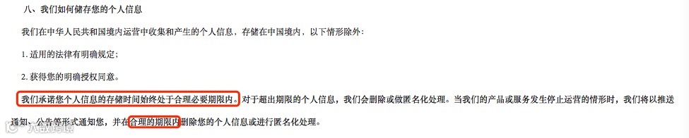 《个人信息安全规范》明确规定,根据个人信息的使用情况,注明不同类型个人信息预计的保留时间(如:自收集日期开始5年内)以及需要删除或销毁的截止日期(如:2019年12月31日或个人信息主体注销账户时)。H公司该条款未明确个人信息存储和删除的具体期限,不符合前述规范的要求。