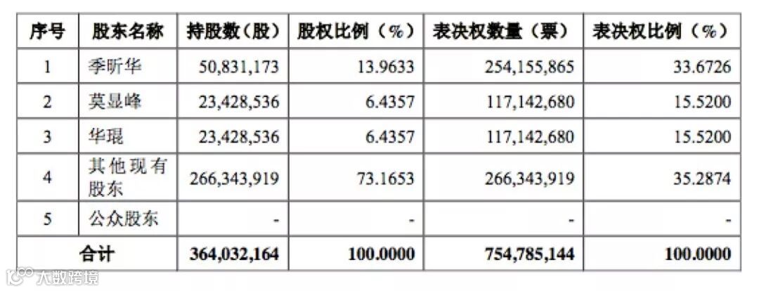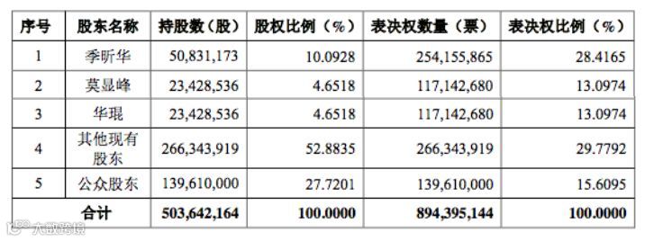 若在本次发行中,按照本次可能发行的最多股数(含全额行使超额配售选择权,即采用超额配售选择权发行股票数量为首次公开发行股票数量的15%)计算,季昕华、莫显峰及华琨在本次发行完成后将合计直接持有优刻得 19.3964%的股 份及 54.6113%的表决权。优刻得发行后的股本及表决权情况如表三(不考虑发行人现有股东参与认购的情况)。