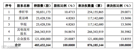 公司本次拟发行不超过12,140万股,按照本次可能发行的最多股数(不含采用超额配售选择权发行的股票数量)计算,季昕华、莫显峰及华琨在本次发行完成后将合计持有优刻得20.1239%的股份及55.7463%的表决权。公司发行后的表决权情况如表二(不考虑优刻得现有股东参与认购的情况)。