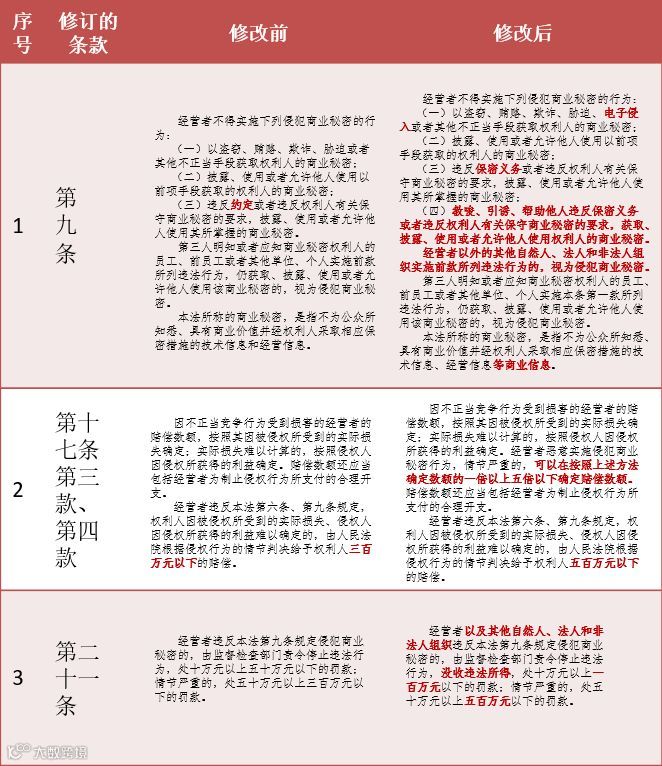 行政处罚增加了“没收违法所得”,将侵害商业秘密的“一般情节”的处罚金额上限由50万元提高至100万元,将“情节严重”的处罚金额上限由300万元提高至500万元。