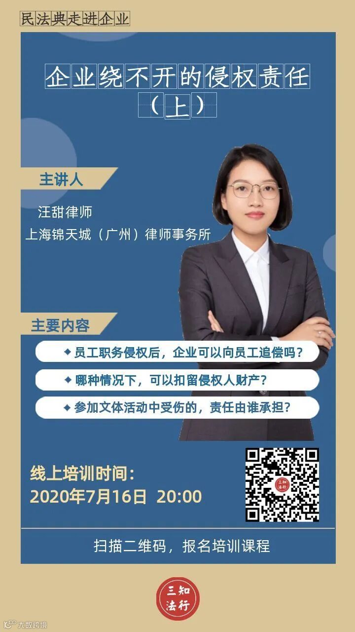 本期“民法典走进企业”系列线上培训第三讲,将为您介绍《民法典》中关于侵权责任的一些新规定。侵权责任编的培训分为两期,本期课程中,您将了解到企业可能遇到在不同情况下的侵权责任纠纷,有助于您在企业管理中提前规避风险,遇到此类纠纷时能更及时有效地应对处理。