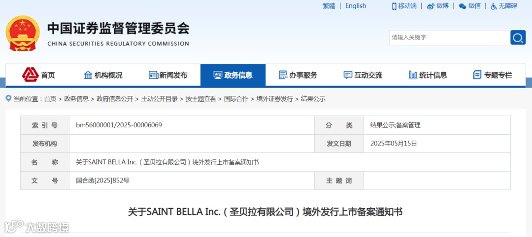中国证监会网站发布关于SAINT BELLA Inc.(圣贝拉有限公司)境外发行上市备案通知书。圣贝拉将计划发行不超过191,666,667股境外上市普通股并在香港交易所上市。