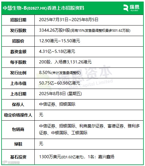 中慧生物,原定于2025年8月8日在港交所挂牌上市,计划全球发售3344.26万股H股(占发行完成后总股份的8.5%,另有15%发售量调整权),其中90%为国际发售、10%为公开发售,无超额配股权。每股发售价介乎12.90~15.50港元,每手200股,最多募资约5.18亿港元。