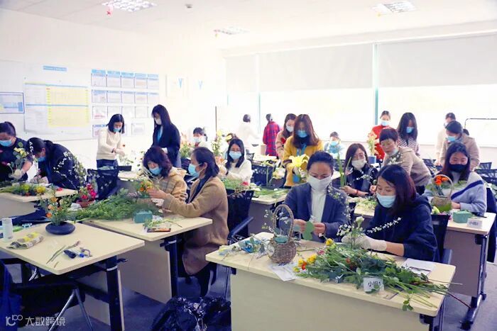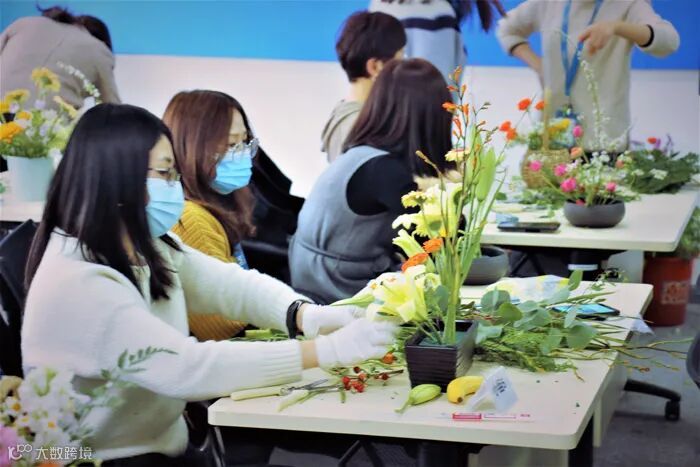 花艺是大家所有耳闻却几乎从未涉及过的领域,大家首先挑选了各自喜爱的花朵与花器,熟悉工具,做好准备工作。在专业花艺老师的讲解与指导下,与历史悠久的美学邂逅。大家充满耐心和热情地迎接挑战,认真细致地构思,以匠人之心,发挥独特的创造力设计制作自己的作品。